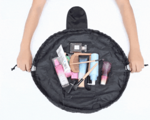 Simply place your items inside, pull the drawstrings to close, and you’re done. When opened, it lays flat so everything is visible and easy to grab.