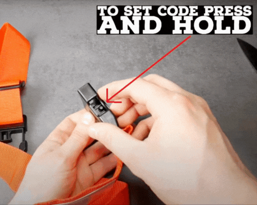 To reset, push the small pin on the side in with your finger, select your new code, then release. Your chosen code will now open the strap.